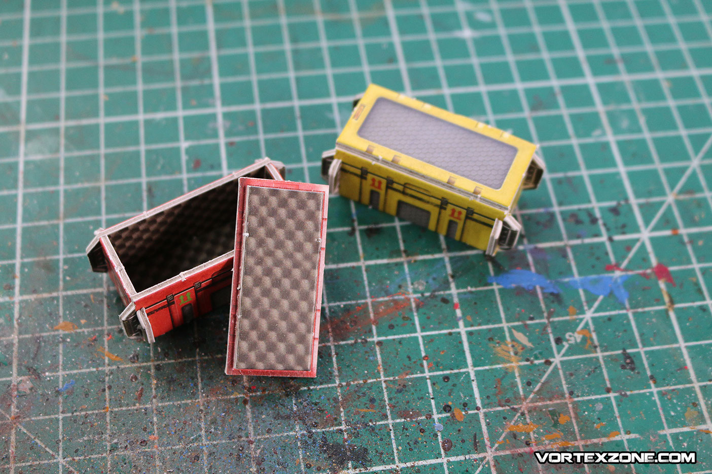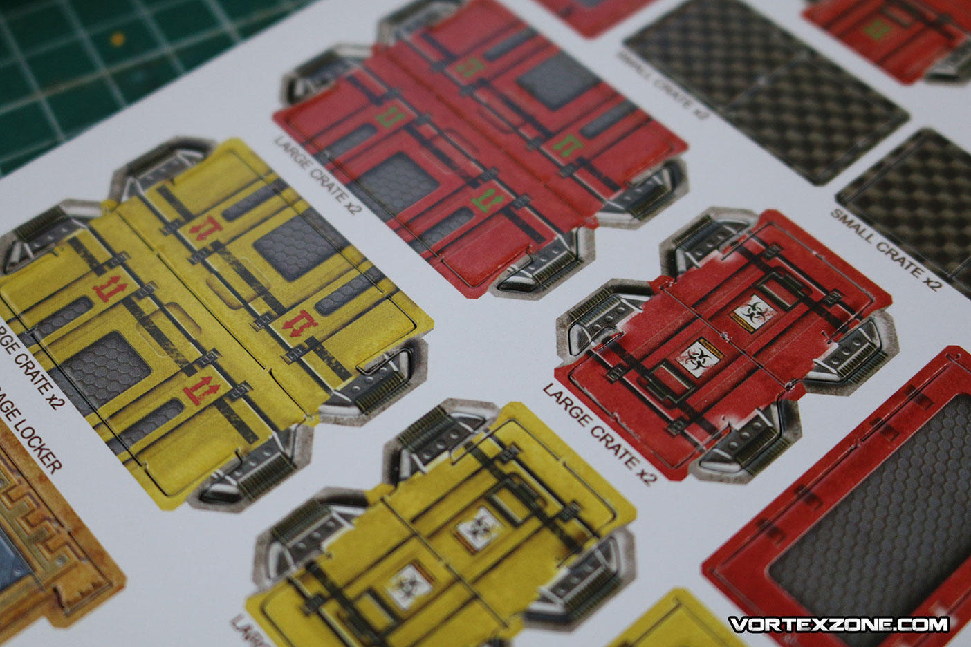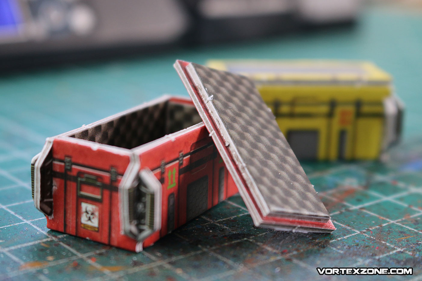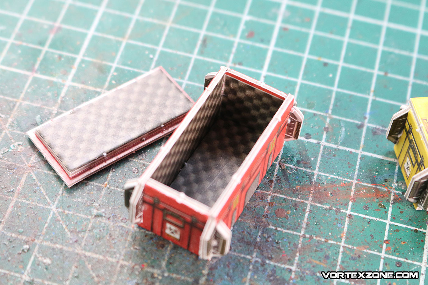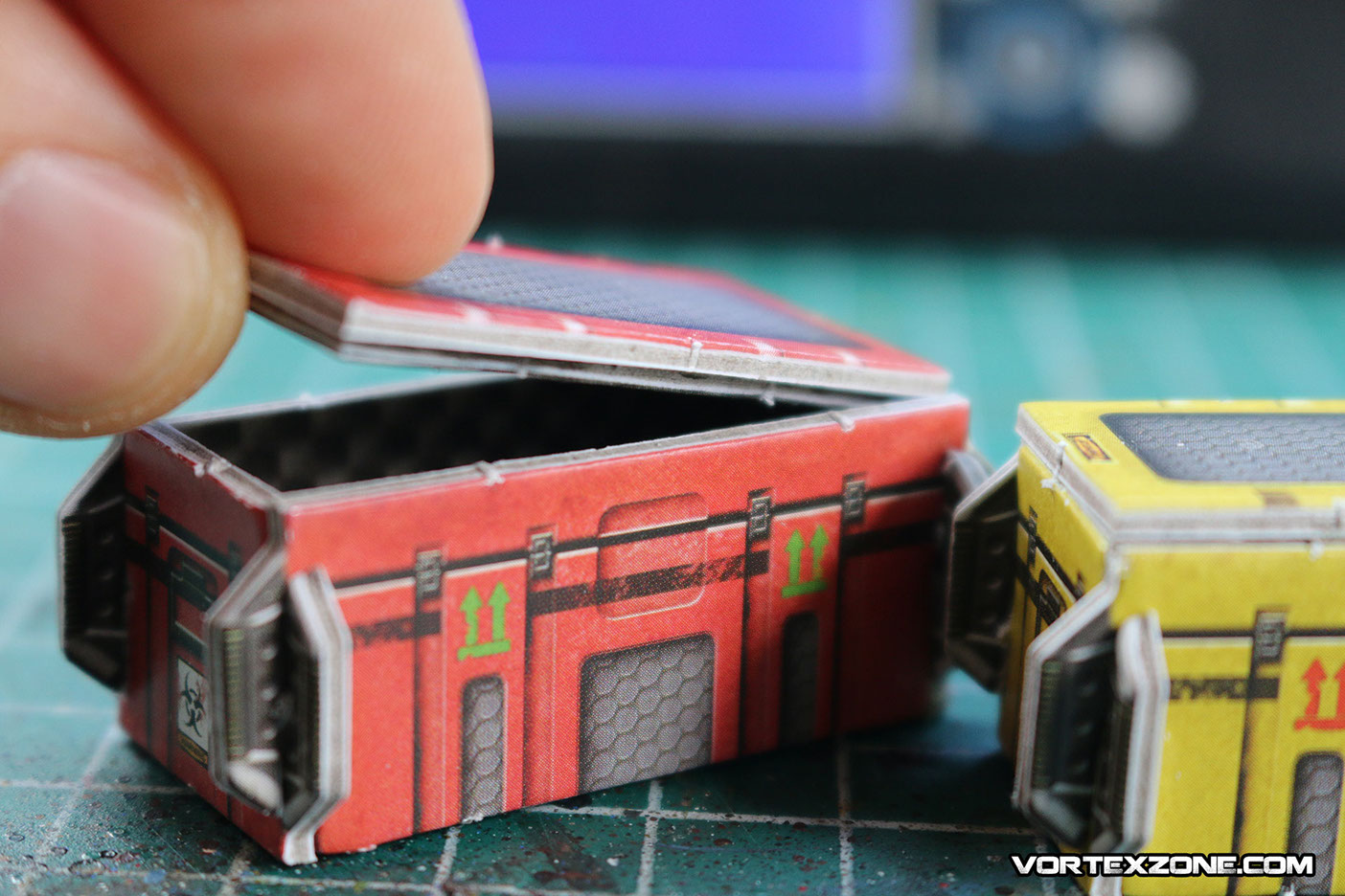 Les couvercles des caisses doivent être collées à la colle à bois ou à la superglue (attention, vu qu'il s'agit de carton imprimé, le positionnement de l'élément sur la colle peut "glisser" un peu. Faites attention à ne pas ripper au risque de coller vos vêtements !)