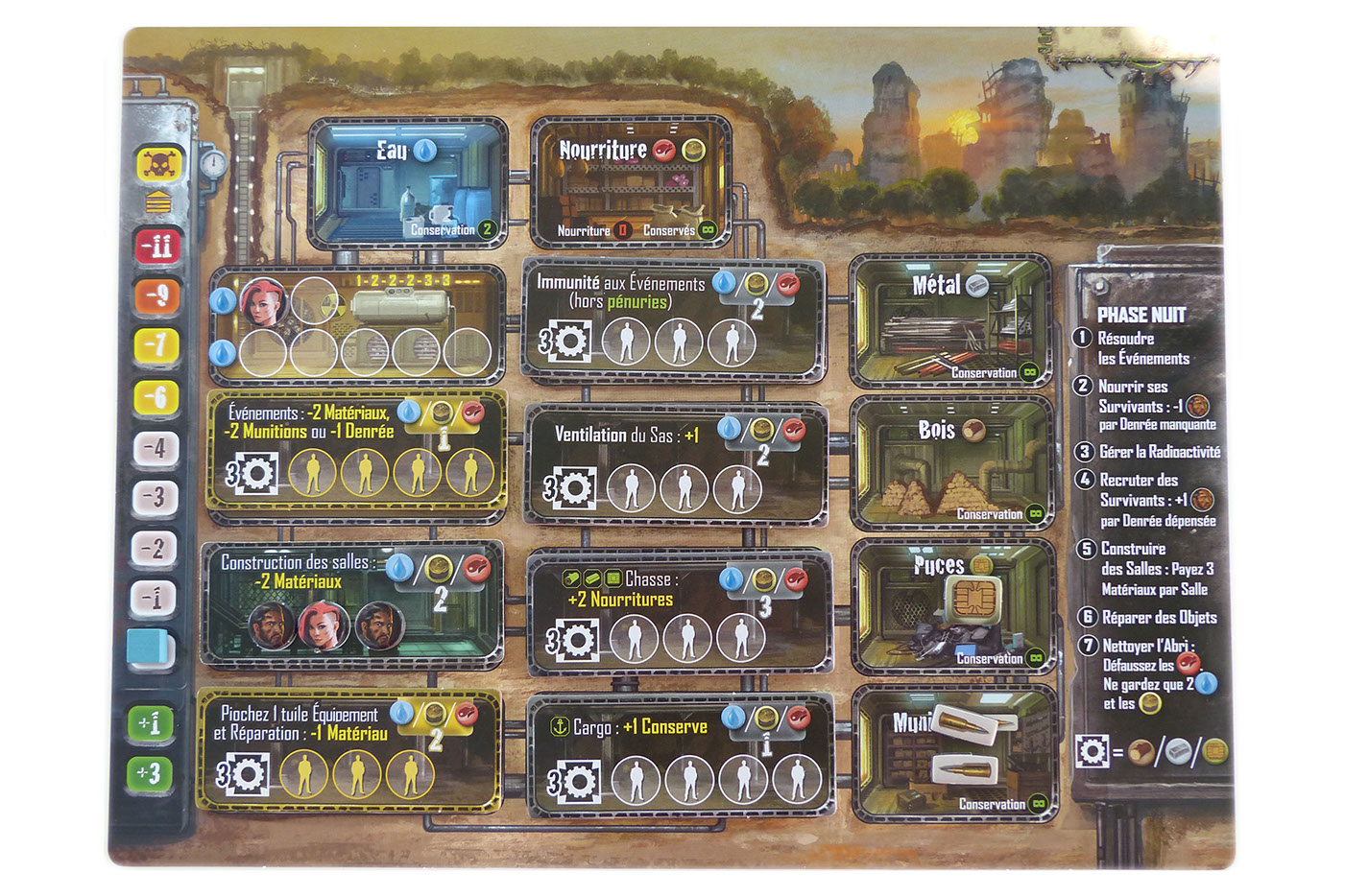 • Nuit : Vos héros retournent à l'abri. Vous allez pouvoir utiliser vos ressources afin de résoudre les évènements, gérer la radioactivité, nourrir votre clan,