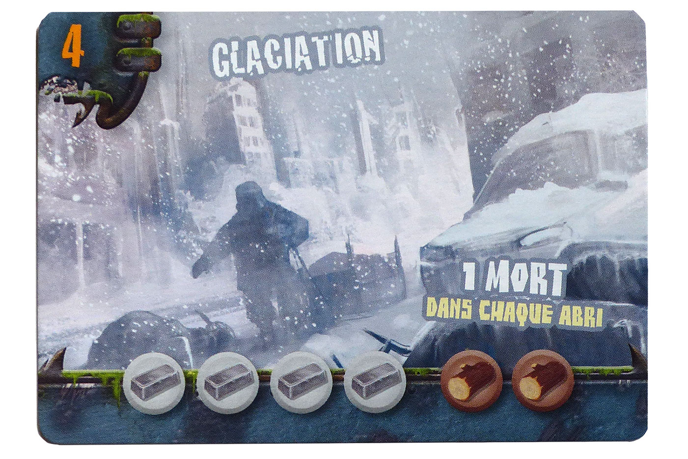 Sur la Carte "Glaciation" vous aurez besoin d'utiliser 4 Métaux et 2 Bois pour empêcher de subir 1 Mort chaque jour. Cette carte rapporte 4 Points de Survie.