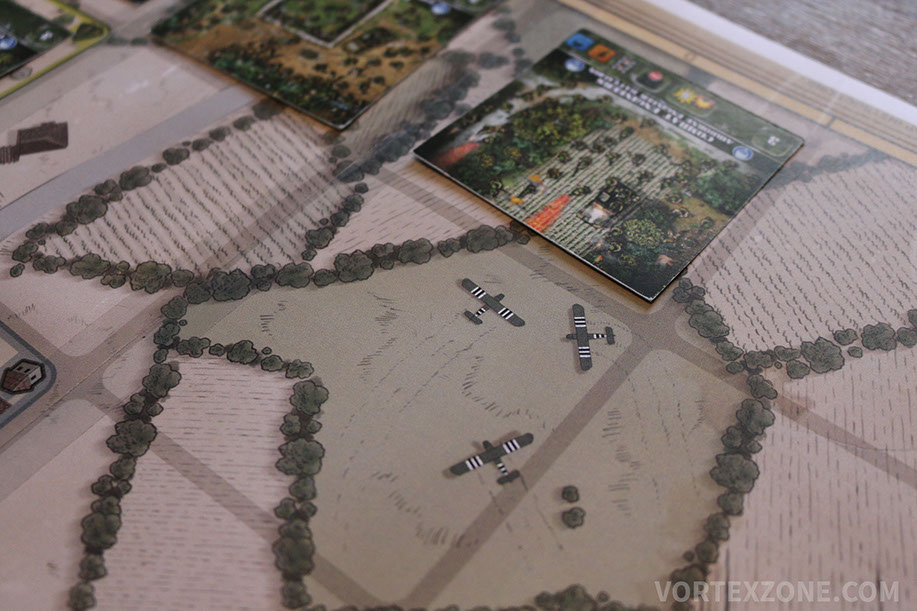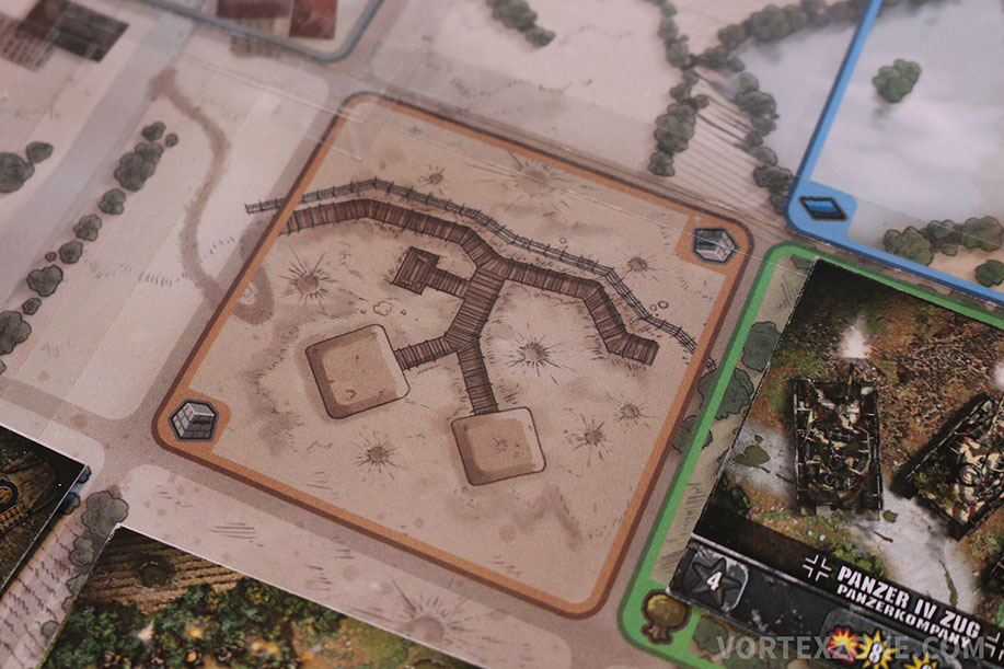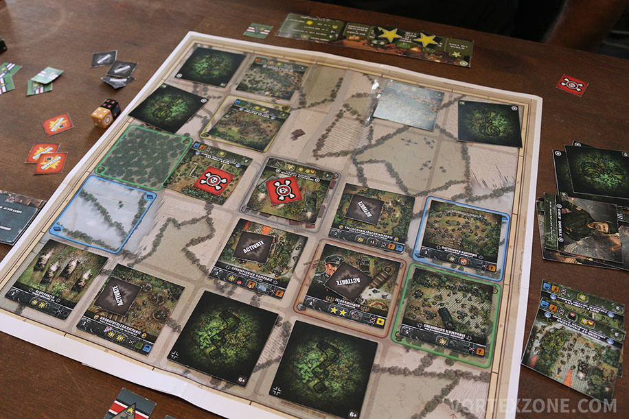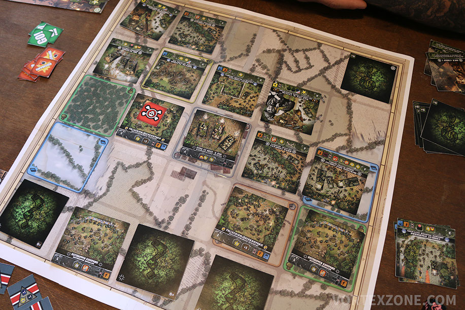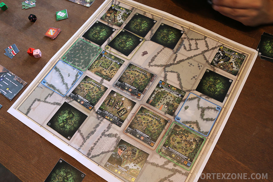 Je me demandais si le plateau, une fois toute les cartes d'unités placées ci et là, était vraiment utile. Je parle en terme de détails et de look. Oui. Définitivement oui. Car même si les cartes recouvrent rapidement le plateau, il réside toujours des espaces visibles, et je n'ai jamais été perdu en ce qui concerne les éléments de terrain (bords colorés selon les terrains, etc.) - je ne parle égoïstement que de mes impressions, vu que Clem, lui, connait le jeu par cœur !