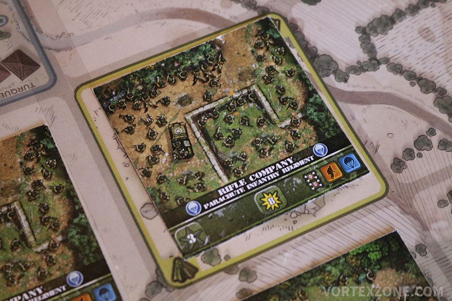 Il y a deux types de cartes : des cartes d'unités (vos compagnies de soldats ou de blindés) et de cartes d'actions (qui vont vous permettre de lancer des attaques supplémentaires, faire des attaques spéciales ou bien améliorer vos défenses, par exemple).