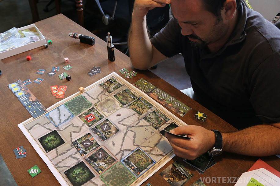 Nous plaçons les 5 cartes du scénario, face cachée, dans mon camp. Clem fait de même de son côté. Les américains engagent l'affrontement.