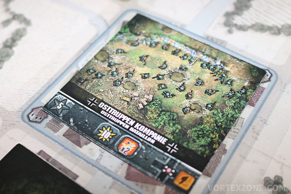 Une carte d'unité. Ici une Compagnie d'Osttruppen (des troupes assez faibles) activée sur un 5+ et ne touchant un ennemi que sur du 10+ !