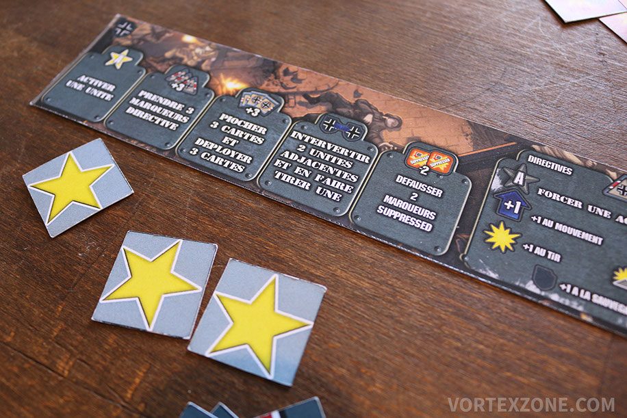 • DÉFAUSSER 2 MARQUEURS SUPPRESSED : Les marqueurs de suppression empêche une unité qui en possède de recevoir des Directives. Vous allez comprendre très vite que cela est très pénalisant (et dépenser une action pour défausser des marqueurs de suppression est également très pénalisant dans un certain sens !)